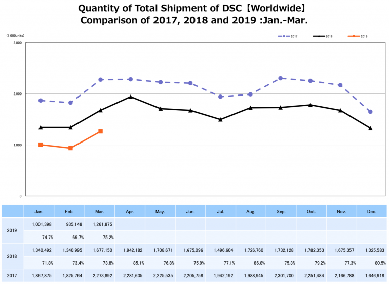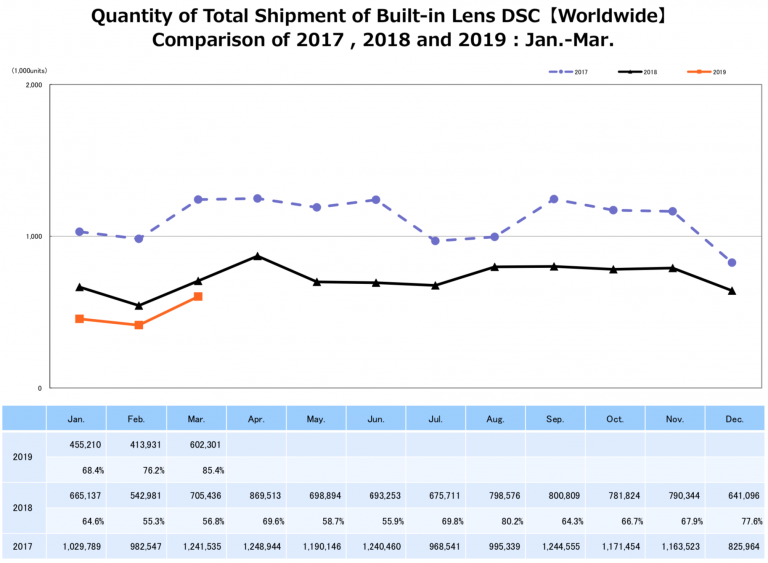 CIPA (Camera & Imaging Products Association in Japan) published their March report and the downturn continues - the total number of shipped digital cameras is lower compared to the same month in previous years (orange: 2019, black: 2018, blue: 2017, click for larger view).